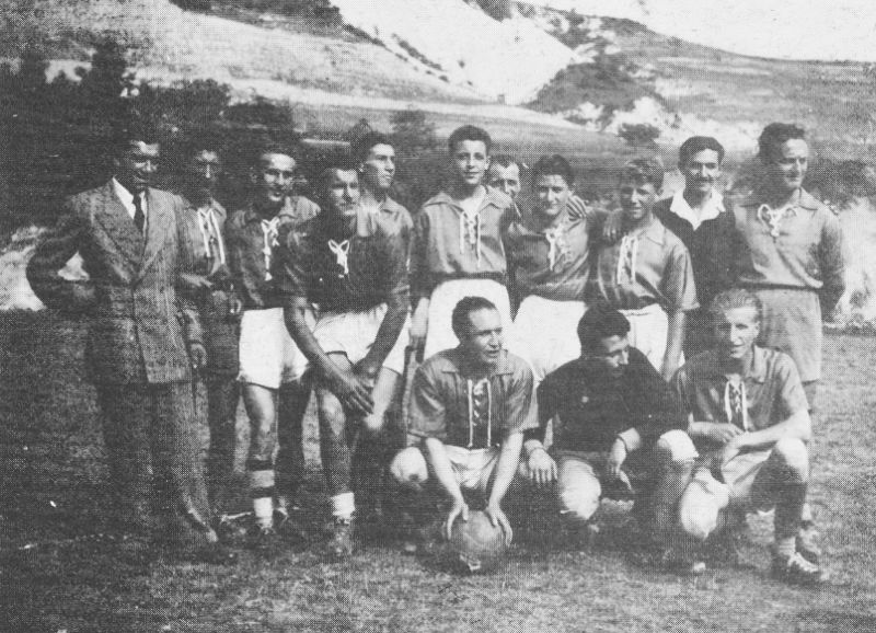 Traverso, calciatore non identificato, Ugo Dameri, Gino Parodi. Accosciati: Carlo Bassano, Lino Carpeneto, Giovanni Dellacasa. |